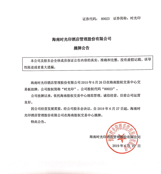 80023 海南時(shí)光印酒店管理股份有限公司:摘牌公告
