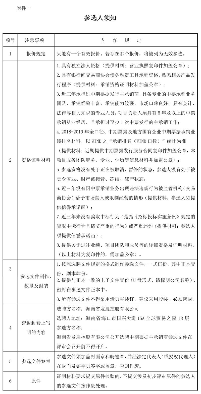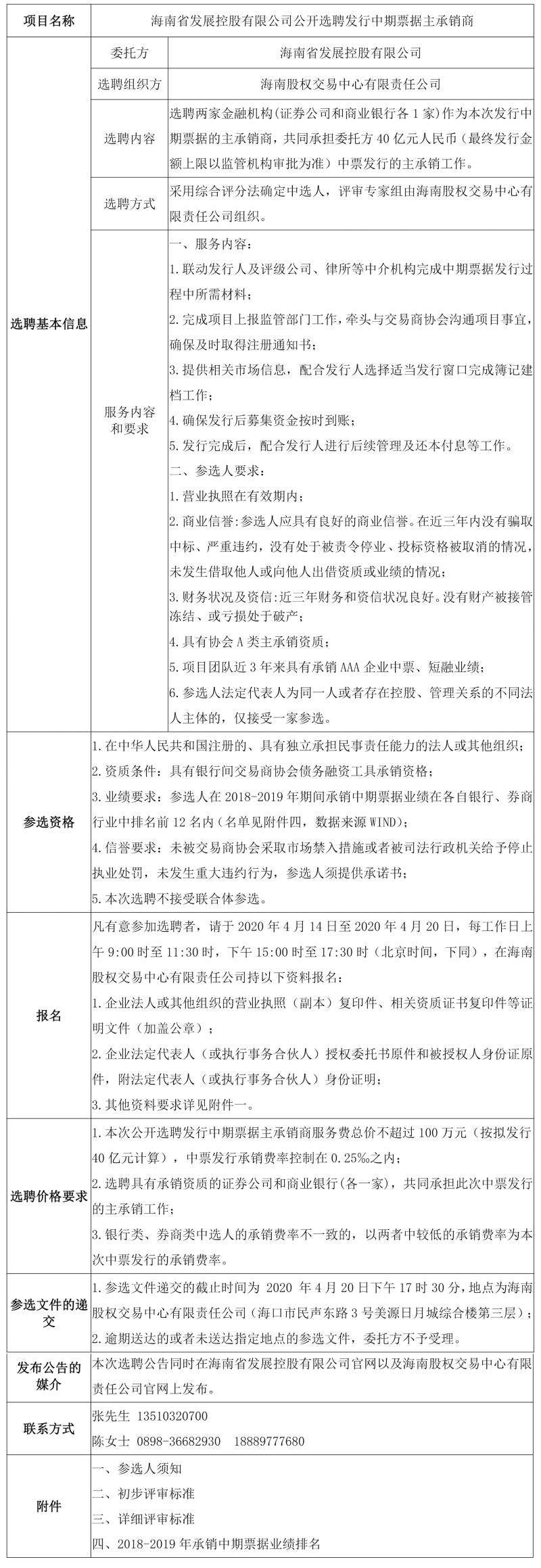 根據(jù)相關(guān)法律法規(guī),受委托,海南股權(quán)交易中心有限責(zé)任公司公開選聘發(fā)行中期票據(jù)主承銷商,為中期票據(jù)發(fā)行提供相關(guān)服務(wù)。歡迎符合條件的商業(yè)銀行,證券公司遵照本公告的有關(guān)規(guī)定報(bào)名參加,現(xiàn)將有關(guān)事項(xiàng)公告如下: