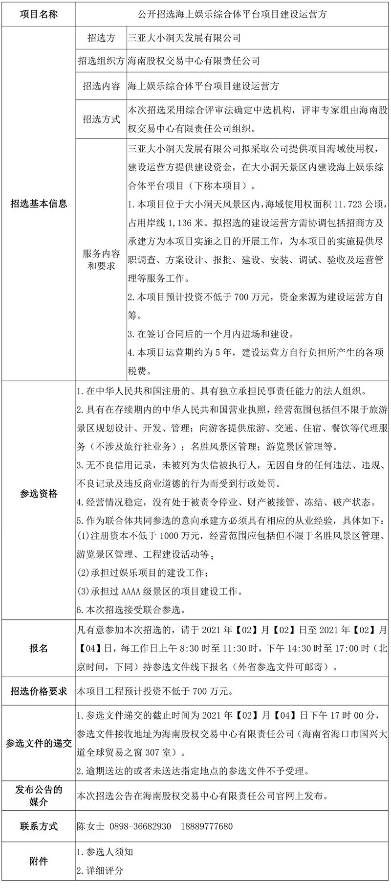 根據(jù)相關(guān)法律法規(guī),受委托,海南股權(quán)交易中心有限責(zé)任公司公開招選海上娛樂綜合體平臺(tái)項(xiàng)目建設(shè)運(yùn)營(yíng)方,為三亞大小洞天景區(qū)的海上娛樂綜合體平臺(tái)項(xiàng)目提供盡職調(diào)查、項(xiàng)目報(bào)批、建設(shè)、生產(chǎn)、安裝、調(diào)試、驗(yàn)收及運(yùn)營(yíng)管理等服務(wù)工作。歡迎符合條件的機(jī)構(gòu)遵照本公告的有關(guān)規(guī)定報(bào)名參加,現(xiàn)將有關(guān)事項(xiàng)公告如下:
