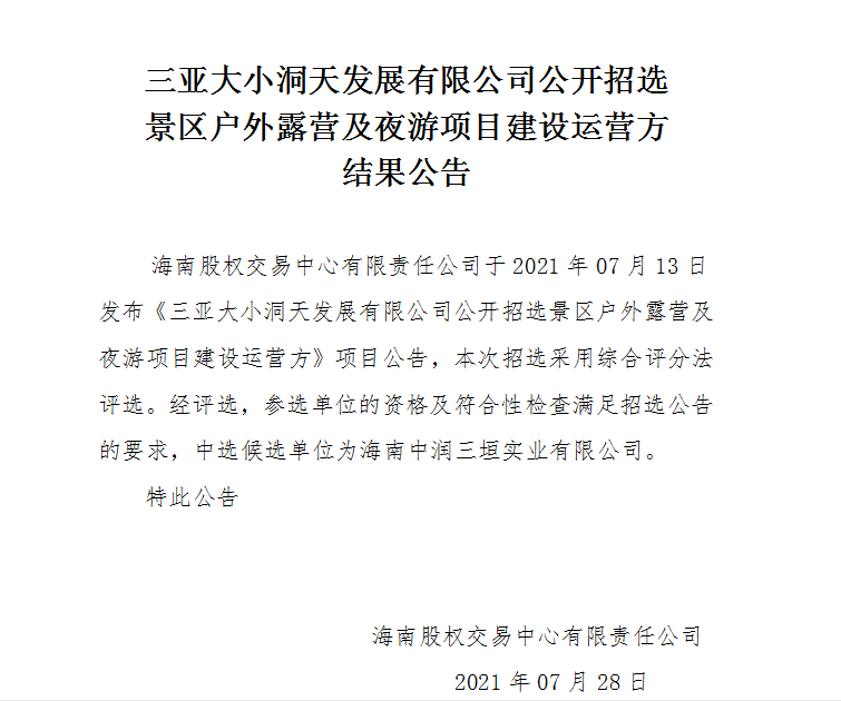 三亞大小洞天發(fā)展有限公司公開(kāi)招選景區(qū)戶外露營(yíng)及夜游項(xiàng)目建設(shè)運(yùn)營(yíng)方結(jié)果公告