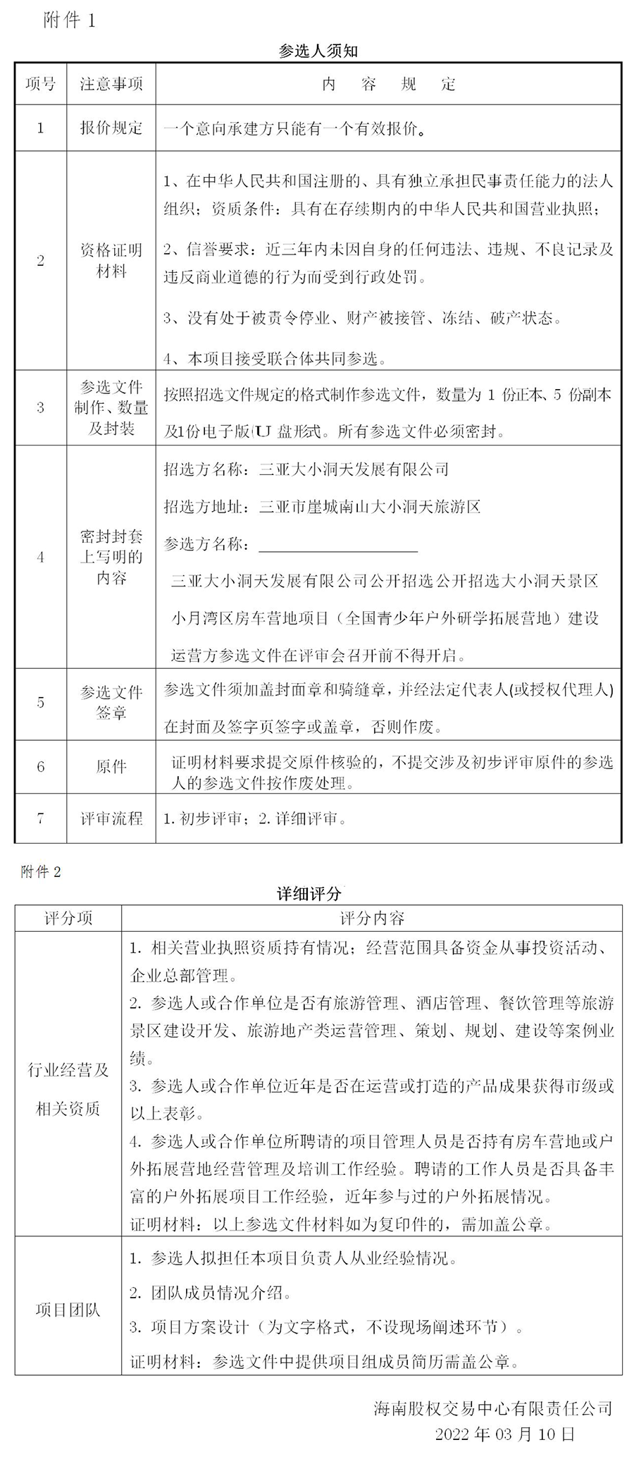 三亞大小洞天發(fā)展有限公司公開招選小月灣區(qū)房車營地項目(全國青少年戶外研學(xué)拓展?fàn)I地)建設(shè)運營方