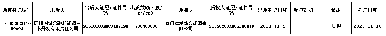 海南國城常青投資合伙企業(yè)(有限合伙)(企業(yè)代碼:993906)合伙人“四川國城合融新能源技術(shù)開發(fā)有限責(zé)任公司”于2023年11月9日在我中心辦理了財(cái)產(chǎn)份額質(zhì)押登記業(yè)務(wù),具體情況如下: