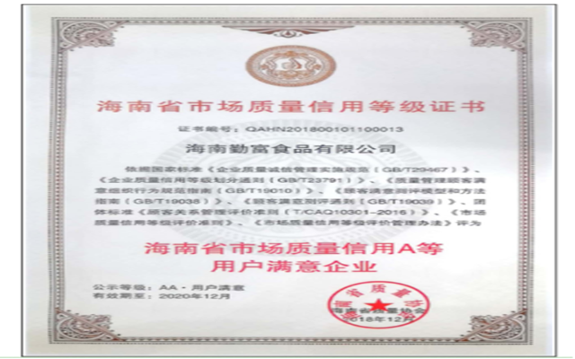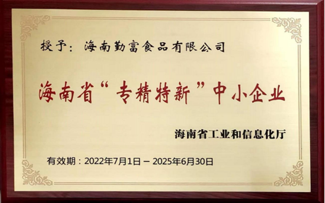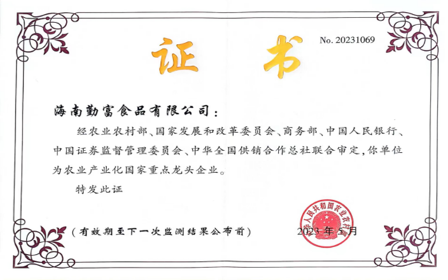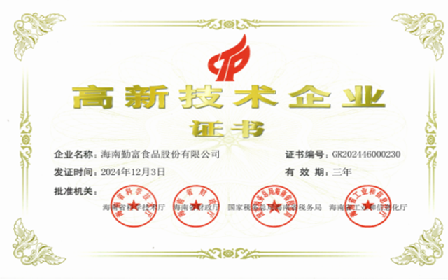 海南勤富食品股份有限公司2018年獲得海南省科技產(chǎn)業(yè)十大影響力領軍企業(yè);連續(xù)獲得海南省第七屆、第八屆、第九屆優(yōu)秀企業(yè);連續(xù)獲得海南省第五屆、第六屆、第七屆杰出民營企業(yè);2019年獲得文昌市脫貧攻堅工作先進單位。